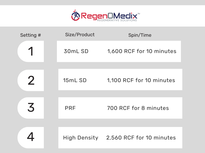 The RegenOMedix™ ZG-TD4B-01 customized laboratory centrifuge machine is compact, versatile, and produces consistent and exceptional results for Platelet Rich Plasma (PRP), Platelet Rich Fibrin (PRF), and Platelet Rich Fibrin Matrix (PRFM) therapy. The centrifuge is designed with finely tuned capabilities and ease of use in mind, with an LCD, a digital rotor imbalance sensor, and an intuitive settings menu. The digital motor controller and rubberized operational pads make it simple to use and take advantage of its customization capabilities. Its programable acceleration/braking system allows the centrifuge to work with many kits in the market.